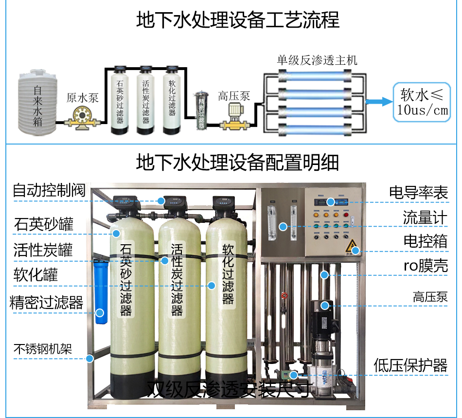 地下水箱→加藥裝置→儲水池→增加泵→一級錳砂過濾器→二級錳砂過濾器→活性炭過濾器→中間水池→增壓泵→石英砂過濾器→活性炭過濾器→軟化過濾器→中間水箱→超濾系統(tǒng)→用水點。