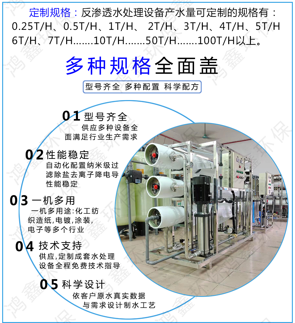 鴻鑫環(huán)保設(shè)備15年專注于水處理凈化工藝的設(shè)計(jì)、生產(chǎn)銷售安裝、設(shè)備維護(hù)、設(shè)備出租、技術(shù)服務(wù)為一體的一站式純水設(shè)備生產(chǎn)廠家,所有的設(shè)備可依據(jù)客戶需求來定制,定制的設(shè)備類型有:市政生活用水處理設(shè)備、直飲純凈水設(shè)備、超濾處理設(shè)備、ro反滲透純水設(shè)備,離子交換純水設(shè)備、EDI超純水設(shè)備、軟化水處理設(shè)備、RO濃水回收設(shè)備、中水回用設(shè)備。