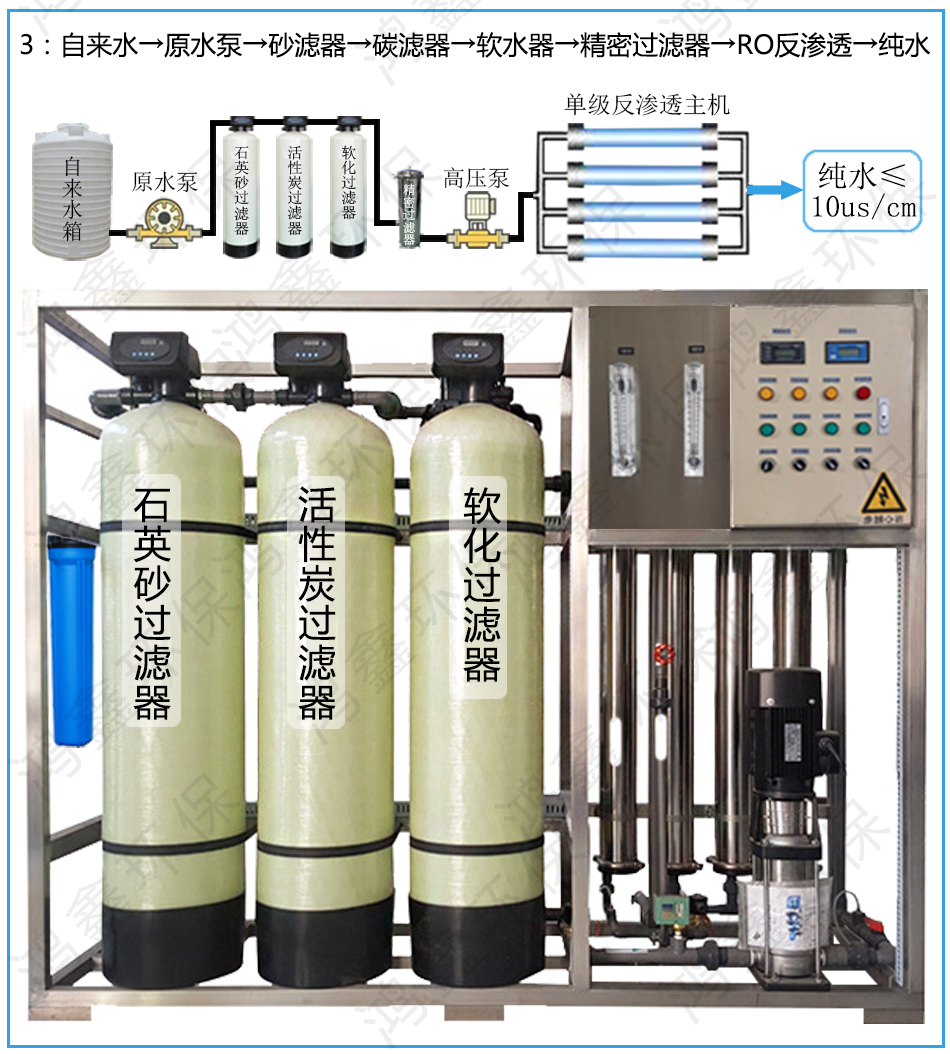 3:自來水→原水泵→砂濾器→碳濾器→軟水器→精密過濾器→RO反滲透→純水。