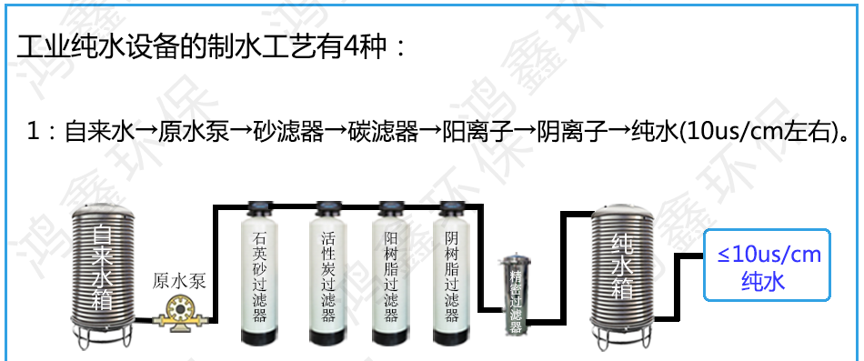 1:自來水→原水泵→砂濾器→碳濾器→陽離子→陰離子→純水(10us/cm左右)。
