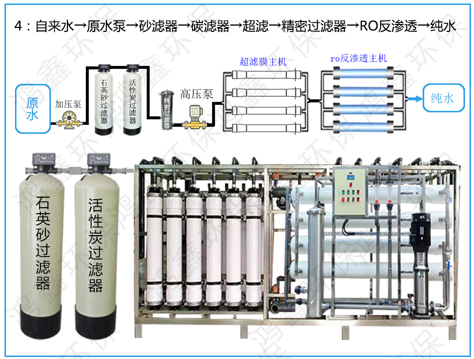 4:自來水→原水泵→砂濾器→碳濾器→超濾→精密過濾器→RO反滲透→純水。