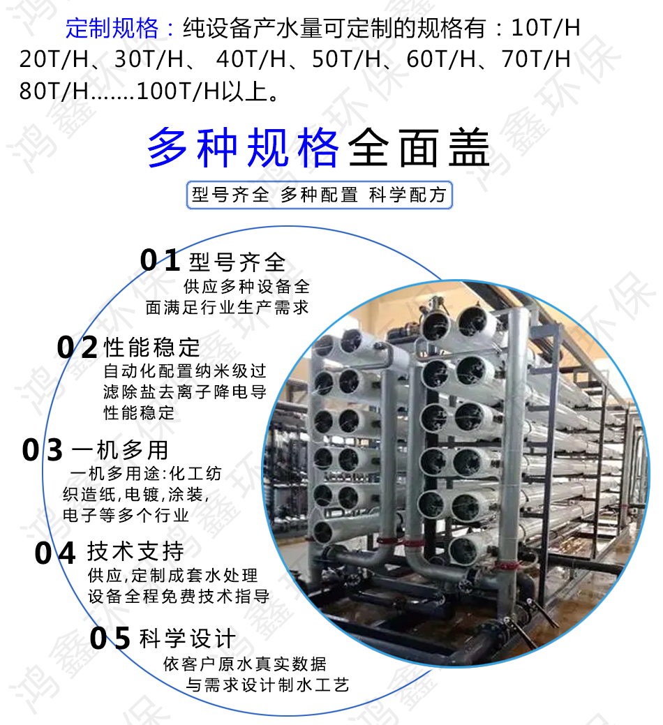 鴻鑫環(huán)保設(shè)備15年專注于水處理凈化工藝的設(shè)計、生產(chǎn)銷售安裝、設(shè)備維護(hù)、設(shè)備出租、技術(shù)服務(wù)為一體的一站式純水設(shè)備生產(chǎn)廠家,所有的設(shè)備可依據(jù)客戶需求來定制,定制的設(shè)備類型有:市政生活用水處理設(shè)備、直飲純凈水設(shè)備、超濾處理設(shè)備、ro反滲透純水設(shè)備,離子交換純水設(shè)備、EDI超純水設(shè)備、軟化水處理設(shè)備、RO濃水回收設(shè)備、中水回用設(shè)備。