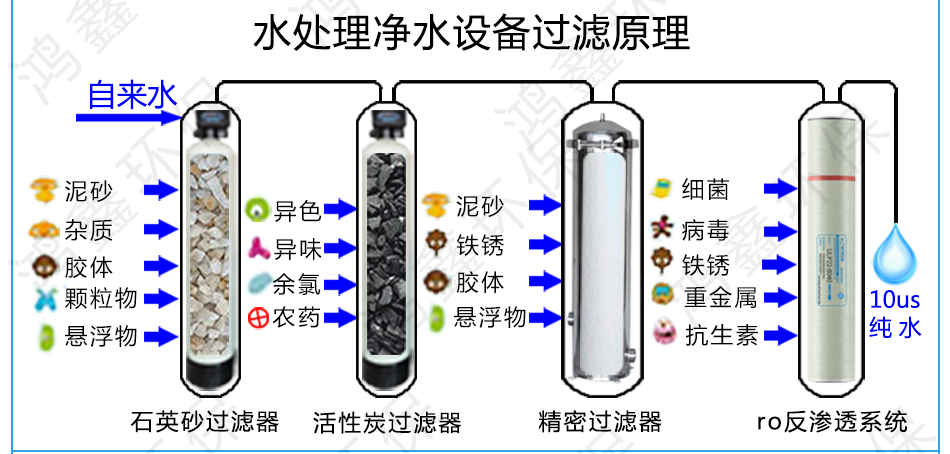 鴻鑫環(huán)保設(shè)備15年專注于水處理凈化工藝的設(shè)計(jì)、生產(chǎn)銷售安裝、設(shè)備維護(hù)、設(shè)備出租、技術(shù)服務(wù)為一體的一條龍服務(wù)企業(yè),所有的設(shè)備可依據(jù)客戶需求來定制,定制的設(shè)備類型有:市政生活用水處理設(shè)備、直飲純凈水設(shè)備、超濾處理設(shè)備、ro反滲透純水設(shè)備,離子交換純水設(shè)備、EDI超純水設(shè)備、軟化水處理設(shè)備、RO濃水回收設(shè)備、中水回用設(shè)備。