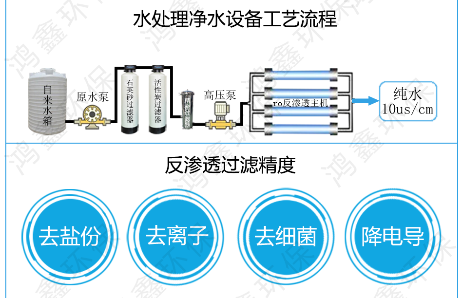 水處理凈水設(shè)備制水工藝是由原水箱→原水泵→石英砂過濾器→活性炭過濾器→RO反滲透系統(tǒng)→純水箱這些組成,也就是水只經(jīng)過RO過濾系統(tǒng)過濾一次,除鹽率一般為98-99%,出水的電導(dǎo)率在5us/cm-10us/cm之間。